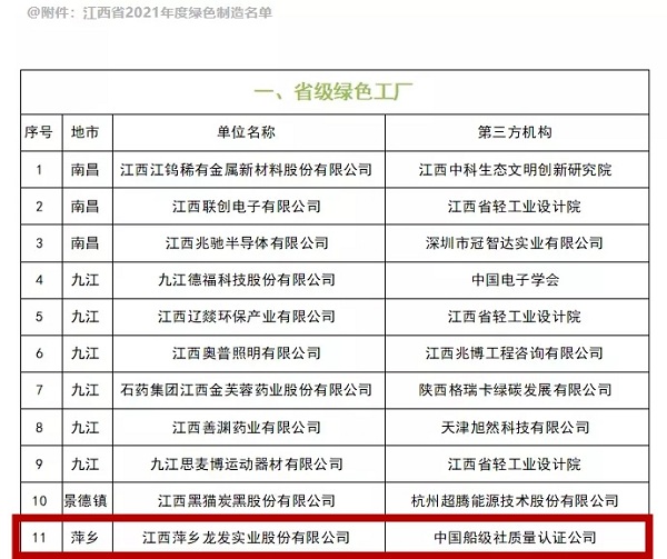 好消息!近日,省工業(yè)和信息化廳公布了江西省2021年度綠色制造名單,剛剛?cè)脒x2021江西省綠色技術(shù)創(chuàng)新企業(yè)培育名單的江西萍鄉(xiāng)龍發(fā)實(shí)業(yè)股份有限公司再次榮耀上榜!為貫徹落實(shí)《江西省綠色制造體系建設(shè)實(shí)施方案》,加快構(gòu)建綠色制造體系,發(fā)揮綠色制造先 進(jìn)典型的示范帶動(dòng)作用,按照《江西省工信...